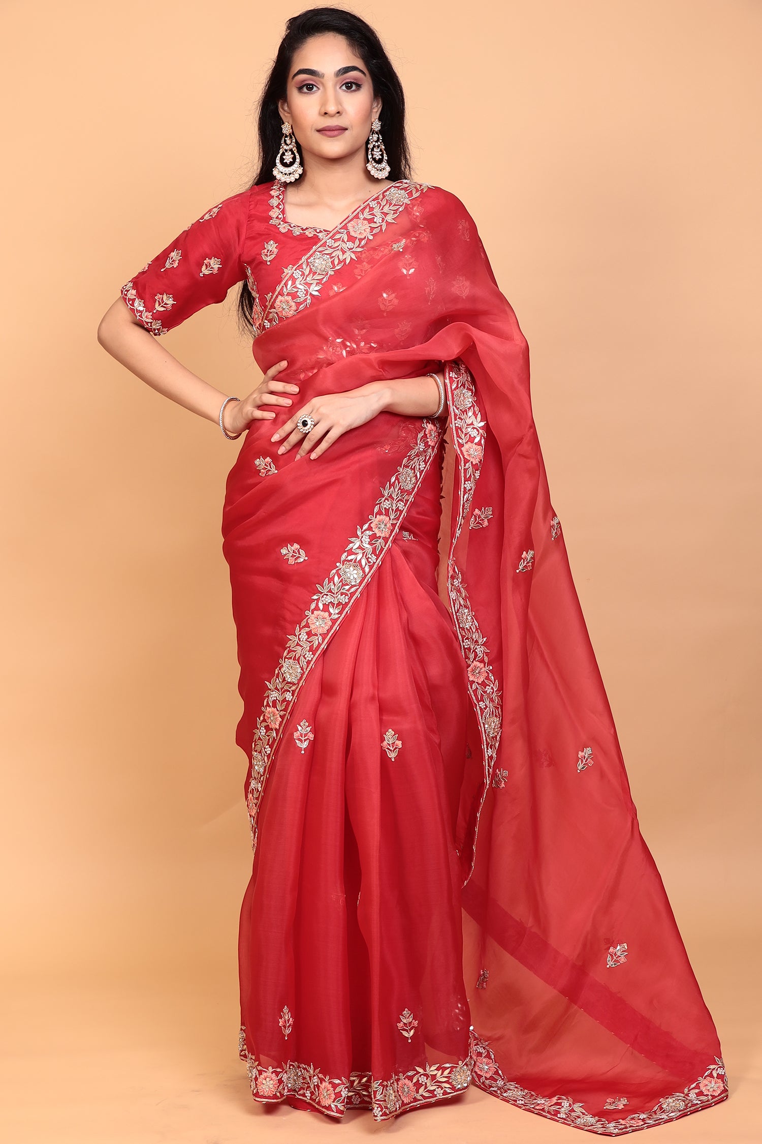 For those looking for sarees for weddings, check out this Organza Saree with Gota Patti & Thread Work in Red. Its intricate embellishment makes it the perfect party-wear saree, ideal for receptions and celebrations. With its adaptable flair, styling organza sarees becomes a delightful exercise in expressing personal taste, adding depth to ethnic fashion for women.