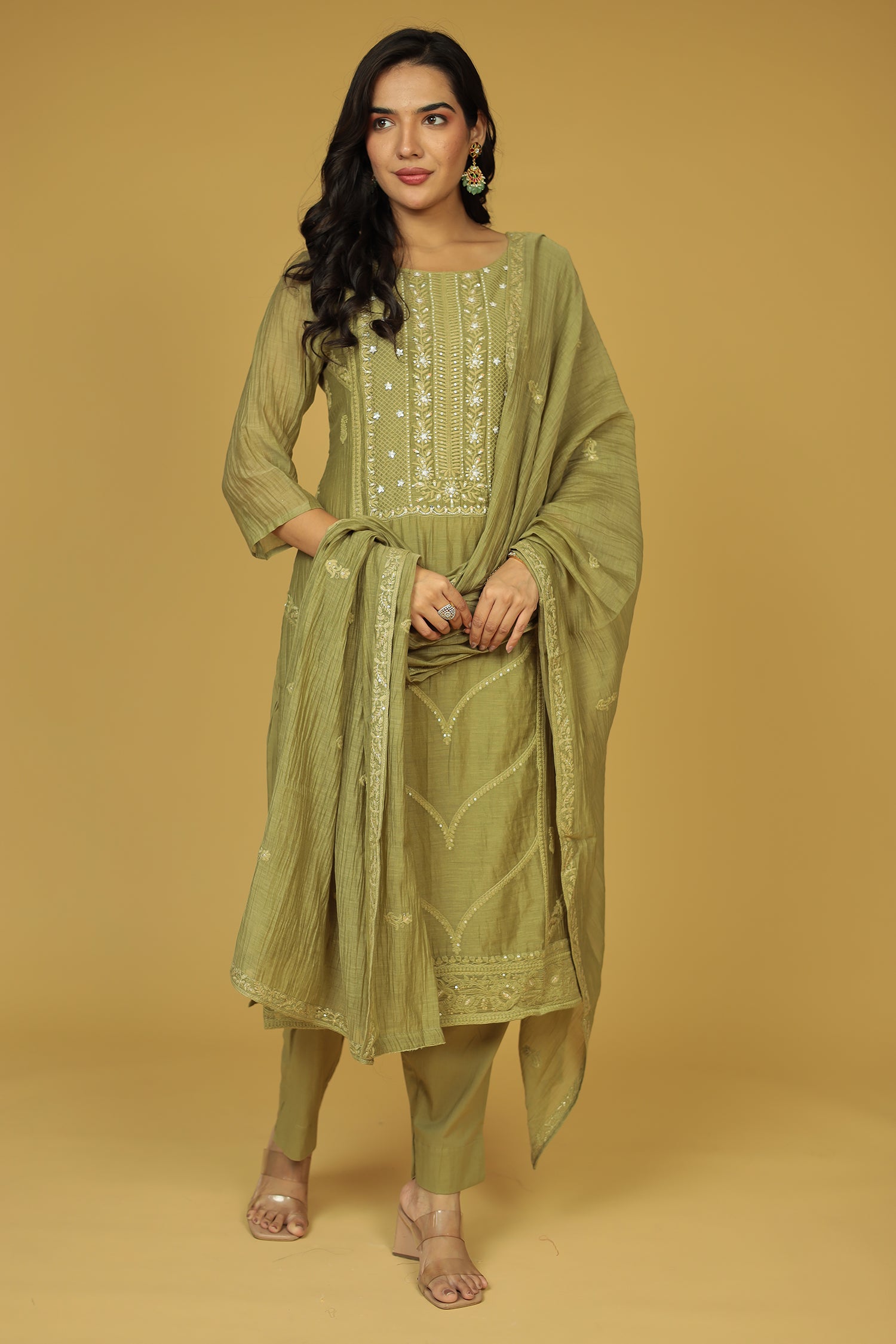 Lightweight yet luxurious, Chanderi suits offer subtle sheen and elegance.