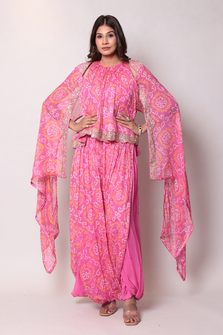Georgette Bandhej Dhoti style jumpsuit with extended sleeves and peek-a-boo at shoulders.